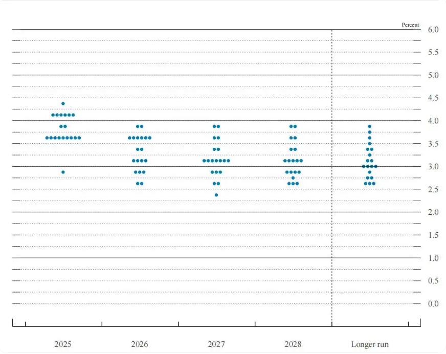 反映每位美联储官员未来利率预期的“点阵图”显示,美联储官员的中位预期是年底前再降息0.5个百分点。这意味着决策层倾向于在年内剩余两次会议上各降息25个基点,使年底利率区间降至3.5%至3.75%水平。